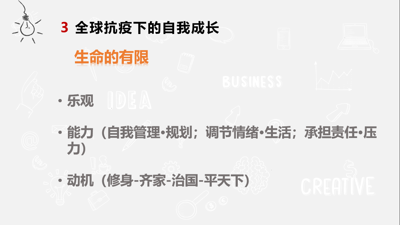 刘欣在讲述中启发同学的思考:如何看待疫情背景下的英雄主义?如何看待个人的生命健康?又如何看待生命中得失与成长?刘欣从积极心理学的角度借用心理学家埃利斯的“情绪ABC”理论向同学们讲解不同的解释风格能够对人在心态、健康和发展等方面产生截然不同的重要影响。因此,刘欣通过案例、数据和方法讲解引导同学们形成乐观的解释风格、良好的行为动机,并且培养自我管理、调节情绪、承担责任的能力。