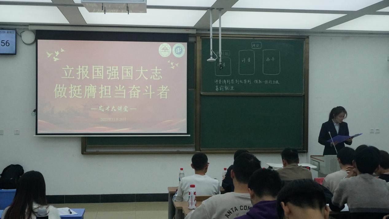 11月29日晚,电气工程学院于兴隆山教学群楼举办“立报国强国大志向,做挺膺担当奋斗者”成才大讲堂系列活动。本次活动由综合管理中心杨柳青主持,2025级本科生辅导员于帆与学生评委到场参会。活动共有16组参赛者进行演讲。