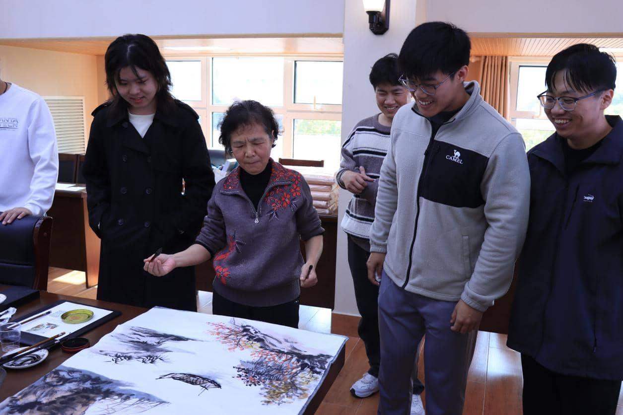 随后,师生们依据共创主题,分组开展合作创作。有的师生共同书写李白《九月十日即事》,有的携手绘制“江涵秋影雁初飞”的秋日景致,一笔一划间凝聚着师生同心的默契,一字一景中承载着对传统文化的传承与对未来的期许。共创作品完成后,全体师生共同展示成果,在镜头前合影留念,将此刻的温暖与美好永久定格。