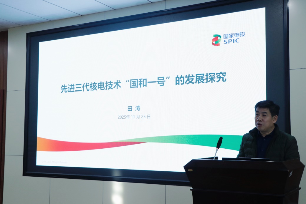 接下来,田涛总经理带来题为《先进三代核电技术“国和一号”的发展探究》的专题报告。报告从世界核电发展脉络切入,系统梳理了核电技术从实验探索到三代革新的演进历程,重点聚焦中国三代核电技术“国和一号”的自主创新与实践,深入剖析了AP1000技术的引进消化吸收过程,以及“国和一号”在非能动安全系统、功率提升、设备国产化等方面的突破性进展。田涛指出,“国和一号”作为单机容量最大的非能动压水堆核电机组,不仅实现了堆芯熔化概率降至10⁻⁷量级的安全目标,更通过模块化施工与标准化设计显著提升了经济性,为我国能源结构转型与“双碳”目标落实提供了关键技术支撑。最后,他结合国电投莱阳核能有限公司的项目建设,展望了“国和一号”批量化推广与产业链协同发展的广阔前景。