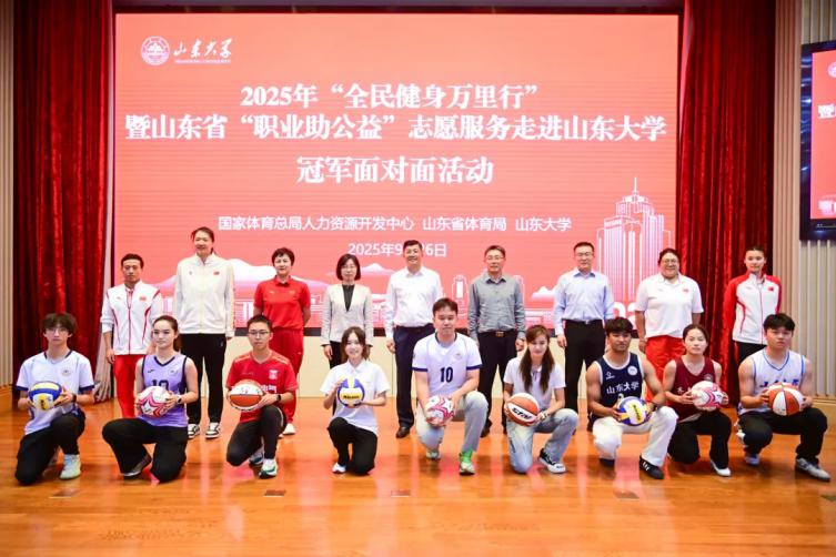 9月26日下午,2025年“全民健身万里行”暨山东省“职业助公益”志愿服务活动在山东大学中心校区举行,世界冠军辛鑫、孙培原和山东省奥运冠军张娟娟、周璐璐、杨方旭,为山大学子带来了一场关于梦想、拼搏与成长的励志课堂。