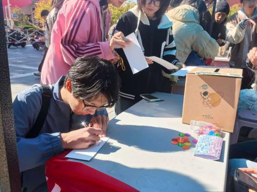 活动现场划分为“荷包DIY”“明信片DIY”与“诗韵闯关”三大互动区域,吸引了众多学生参与。同学们在游戏中感受文化魅力,在互动中传递关怀力量,整场活动洋溢着温暖而真挚的氛围。