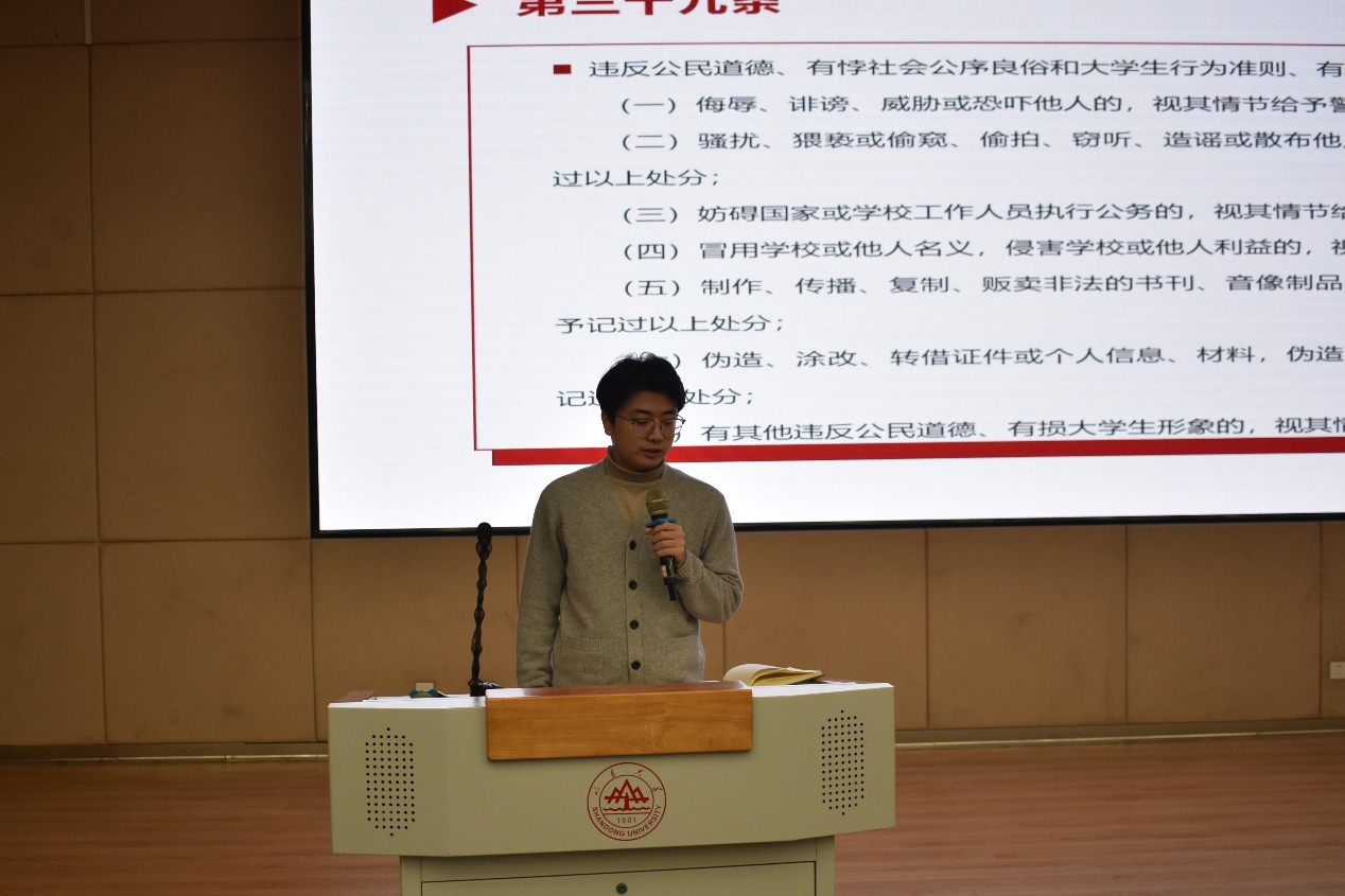 谷宜恒首先就学校有关规定进行了强调与解读,结合考试违纪案例,指出广大同学应牢记校规校纪,遵守规章制度,杜绝携带违规材料、抄袭他人答案、代替他人考试等行为,共同营造良好考风考纪。