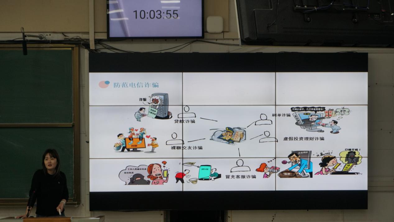 会上,滕丹结合当前高发的电信诈骗类型,向同学们系统讲解了常见的诈骗手段及其防范措施,通过真实案例剖析,提醒同学们在日常生活中时刻保持清醒、提高警惕,增强防范意识,切实筑牢安全防线。