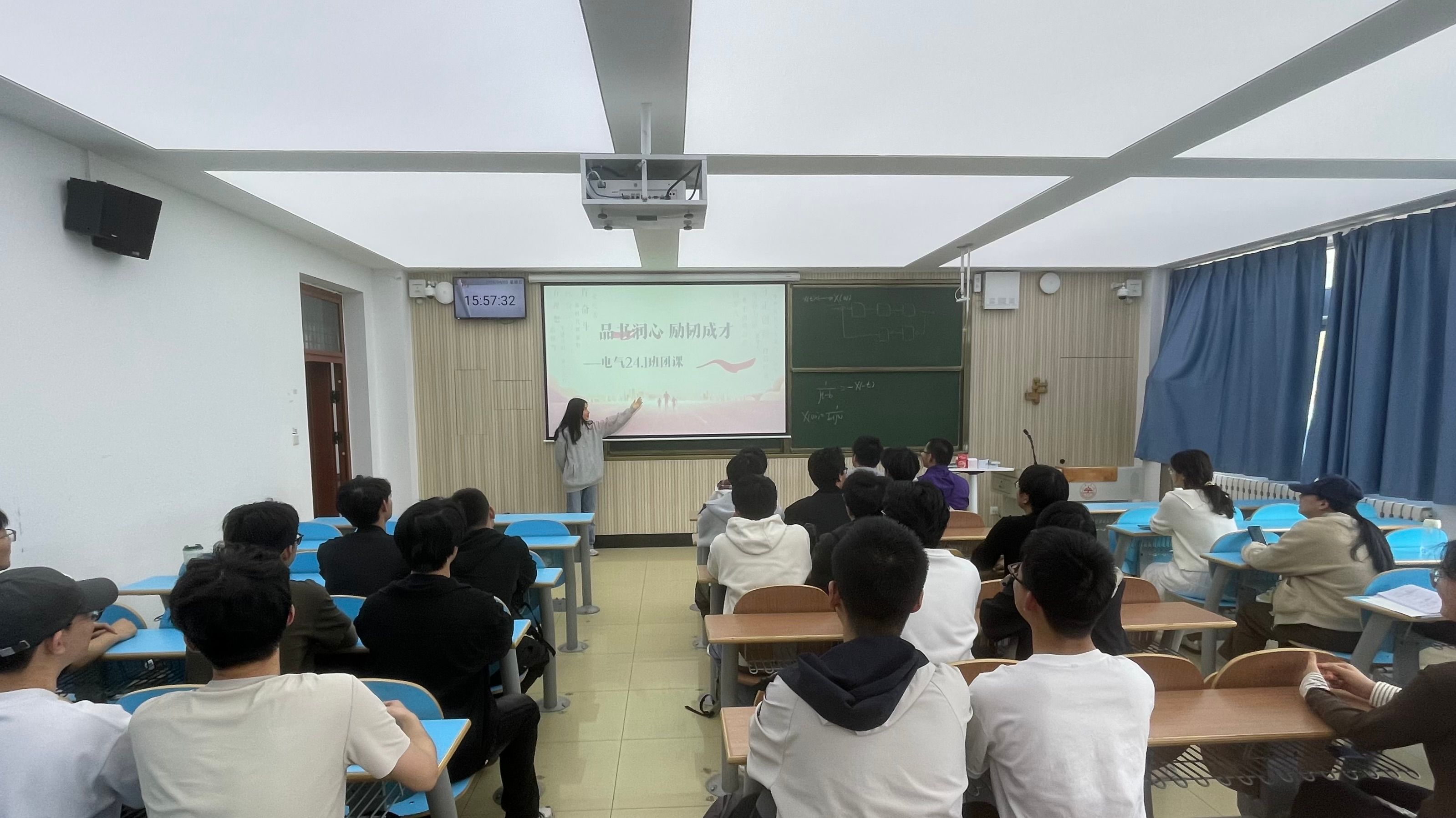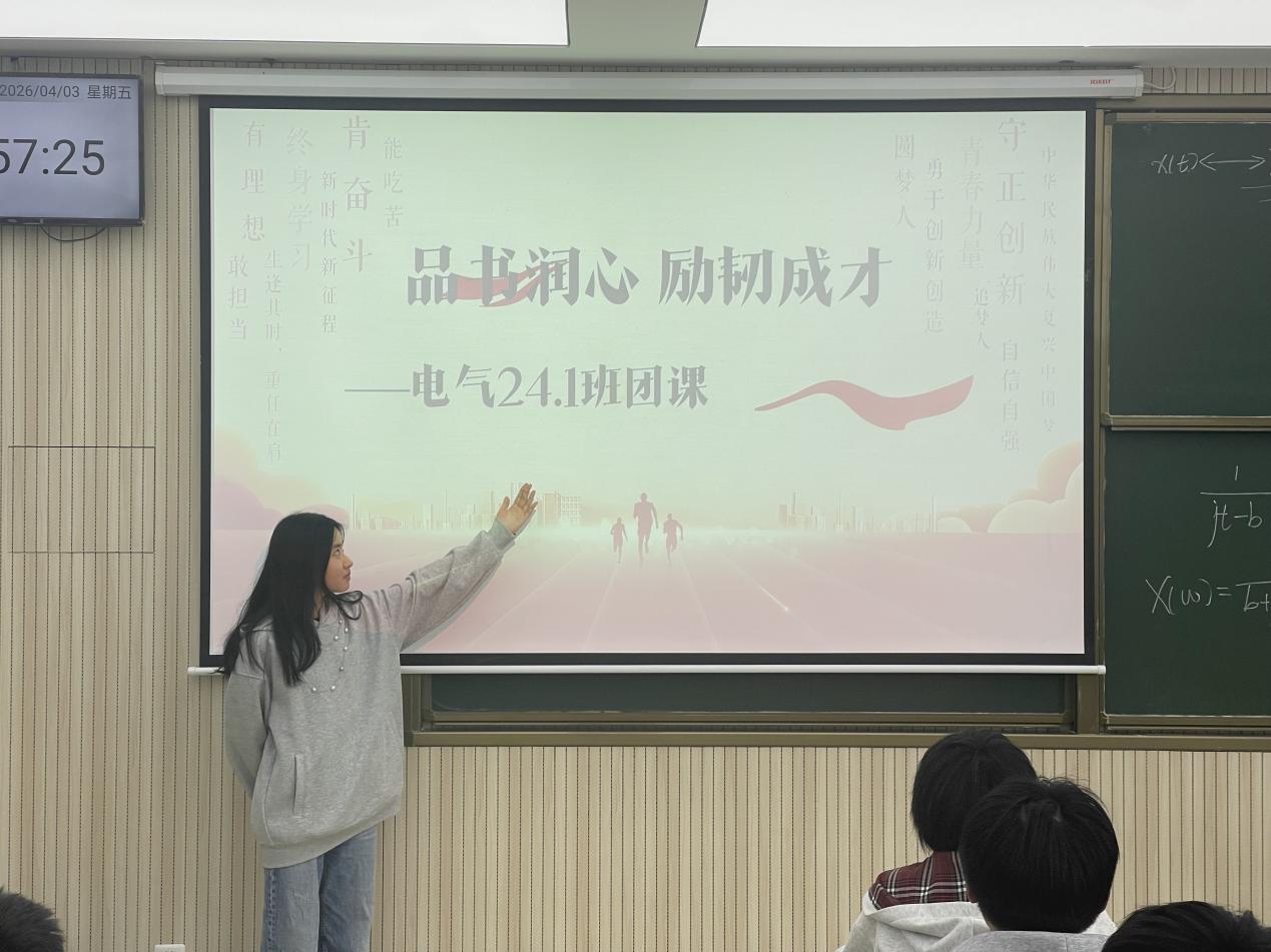 为营造班级爱读书、读好书的良好氛围,增强班级凝聚力,推动形成积极向上的班风、学风,4月3日,电气工程学院2024级1班在教学群楼开展“品书润心·励韧成才”主题团课。本次活动由团支书袁琦主持,1班全体同学参加。