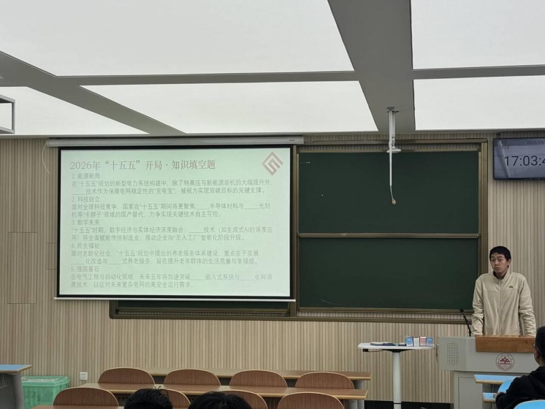 活动伊始,吴铭伟带领全体团员集中学习“十五五”规划相关视频内容。他结合视频核心要点,细致解读规划中的发展战略与时代要求,立足电气工程专业特色,引导团员们将个人学业与国家发展大局相结合,明晰青年一代的责任与使命。学习过程中,团员们认真聆听、专注记录,深入了解国家发展蓝图,进一步坚定了理想信念,筑牢思想根基,营造了浓厚的理论学习氛围。