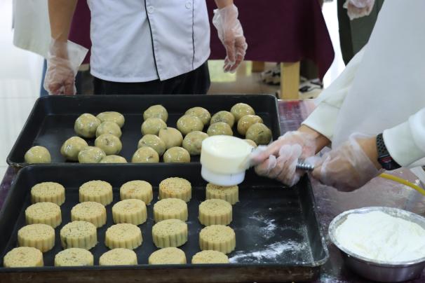 活动现场,工作人员以印有月亮、玉兔等元素的中秋主题心愿卡为参与学生分组,小组成员们通过2-3分钟自我介绍快速熟络。随后,食堂师傅现场演示月饼制作步骤,重点讲解饼皮厚度控制、馅料大小、防外露等技巧,同学们在师傅指导下分工协作,共同完成五仁与芒果提子两种馅料的月饼制作与压模定型。随后,食堂师傅将月饼送入烤箱,主持人组织破冰活动活跃现场氛围,来自不同专业的学生通过趣味游戏进行故事分享、经验交流,现场氛围轻松热烈。在此期间,参与成员也跟随食堂经理的脚步,走进了舜园食堂的后厨操作区,实地探访了月饼从原料到成品的诞生过程,亲身感受了食堂在食品安全管理上的严谨与细致。待月饼冷却后,同学们将亲手制作的月饼分装带走,与老师、好友分享团圆滋味。
